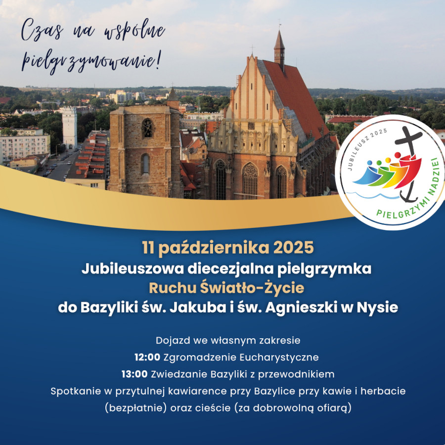 W imieniu Moderatora Diecezjalnego Ruchu Światło-Życie (ks. Łukasza Michalika) zapraszamy na pielgrzymkę jubileuszową Ruchu Swiatło-Życie do Bazyliki sw. Jakuba i sw. Agnieszki w Nysie.