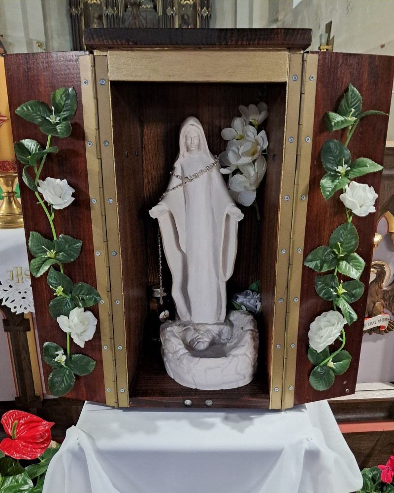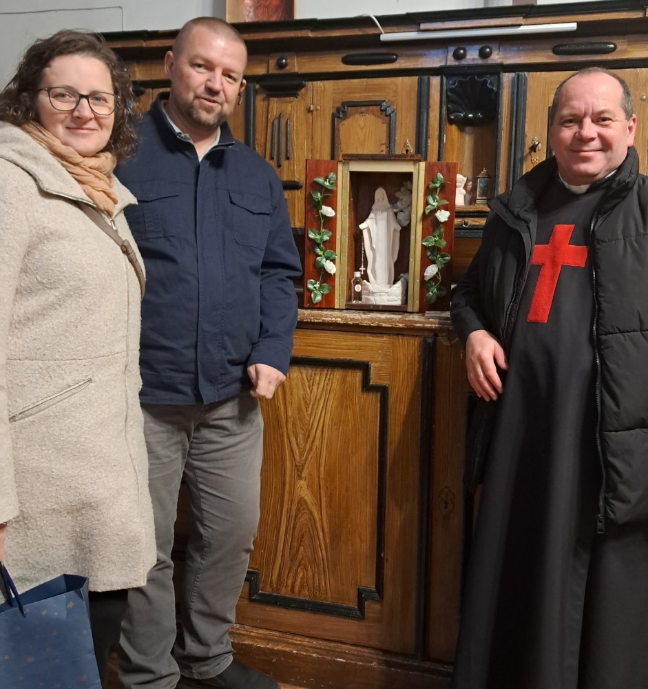 W piątek 24 października figura Matki Bożej została przywieziona do Paczkowa i umieszczona w prezbiterium (foto 1,2,3). Dzień później, w sobotę o godz. 17.30, odbyło się nabożeństwo różańcowe w intencji małżeństw i rodzin parafii, z modlitwą o Boże błogosławieństwo dla idei powołania Kręgu Domowego Kościoła. Obecność figury stworzyła w parafii atmosferę skupienia i duchowego otwarcia. W ramach peregrynacji parafianom przybliżono również duchowość Ruchu Światło–Życie oraz postać jego założyciela, Czcigodnego Sługi Bożego ks. Franciszka Blachnickiego. Na zaproszenie o. Leszka do Paczkowa przyjechali Aleksandra i Andrzej Kordkowie z Kędzierzyna-Koźla, którzy podczas niedzielnych Mszy świętych 26 października złożyli świadectwo życia i formacji w Domowym Kościele. Podczas wieczornej Eucharystii swoje świadectwo złożyła również Para Rejonowa z Prudnika (foto 4). Te wydarzenia stały się dla wielu „ziarnami rzuconymi w ziemię”, rodząc pragnienie dalszego wzrostu. Dopełnieniem peregrynacji było niedzielne nabożeństwo różańcowe przy odnowionym krzyżu na ul. Cisieckiej, ofiarowane w intencji osób niosących pomoc poszkodowanym w powodzi z września 2024 roku. Modlitwa zgromadziła licznych parafian i stała się wyrazem solidarności oraz wdzięczności. Na to nabożeństwo zabraliśmy ze sobą wspomnianą figurkę Maryi.